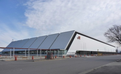 A 28-meter maglev train that ran on a test rail in Yamanashi Pref. is exhibitied.
