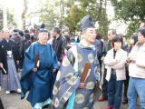 | ex. Take the 10:51 a.m. express bound for Nishio on the Meitetsu Line from Meitetsu Nagoya station.(Track No.4) Arrive at Nishio station at 11:29 a.m. You will find a train for Gamagori on the line left side (Track No.2) The train leaves at 11:47 and arrives at Fukuchi station at 11:50. Get off the train and cross the tracks and turn to the left along the tracks. Cross the street and go straight. You will see white guardrails and greenhouses. Cross the street with traffic signals and go straight. You will find many flags of the shrine and thick trees on the right. That's the Hachiman Shrine yard. 2007 |